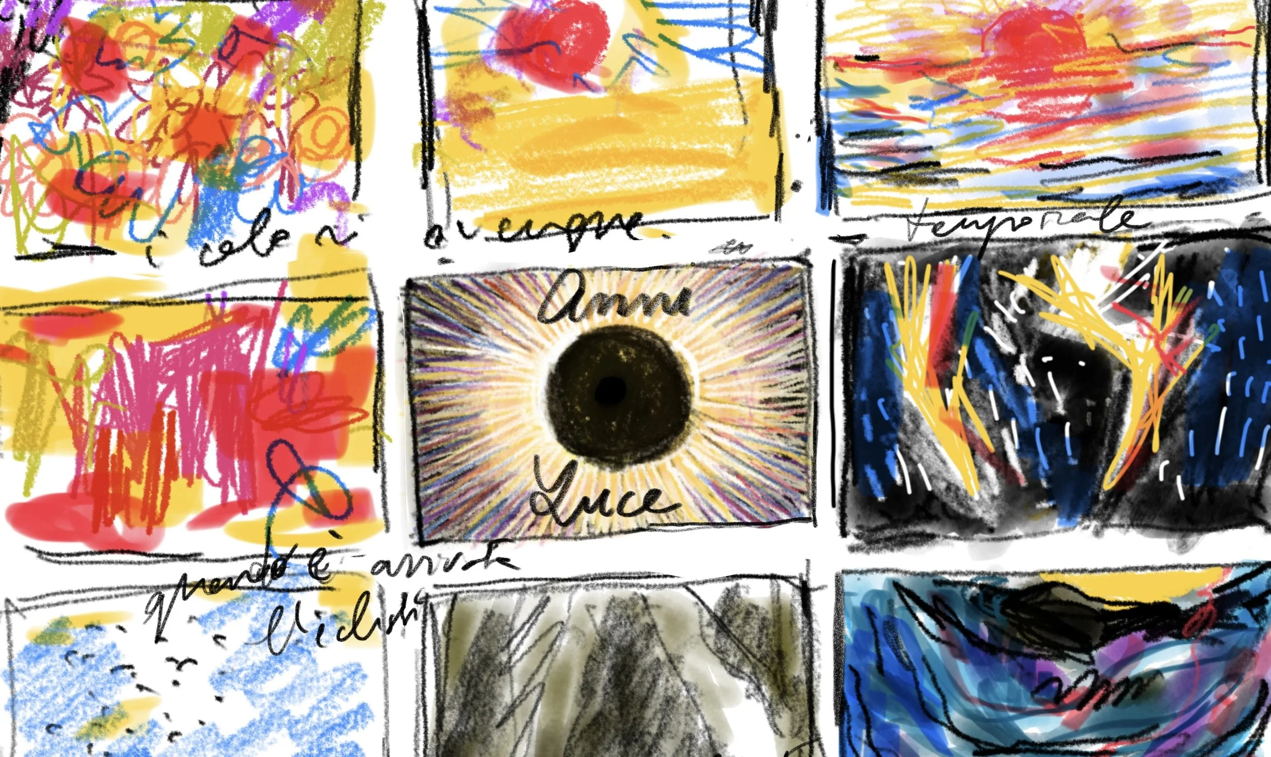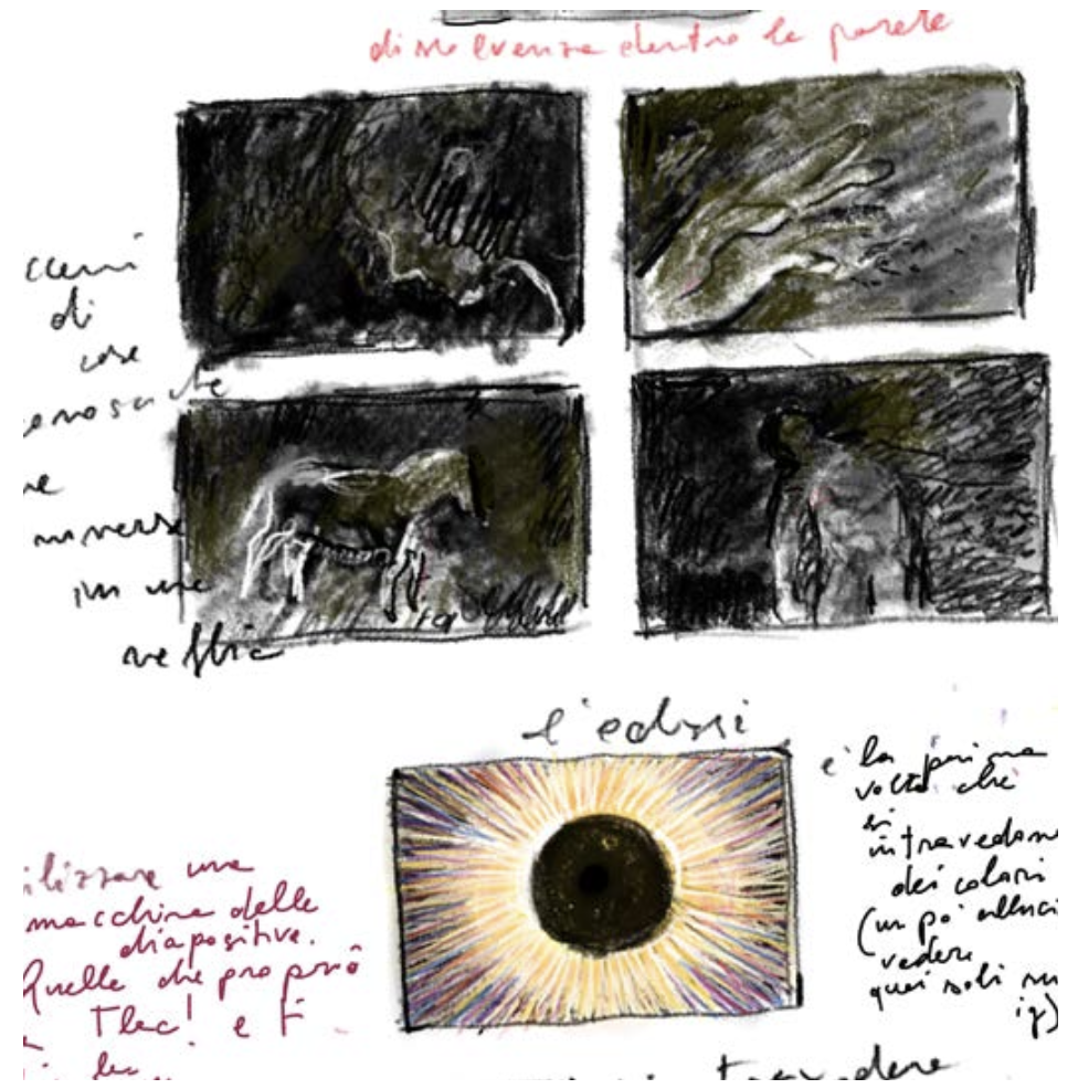 Una proiezione di luce e colore che riprende le tecniche dei primordi del cinema, con l’utilizzo di inchiostri, pittura, un tavolo luminoso e un ipad. Una lanterna magica contemporanea che produce immagini in tempo reale, utilizzando materia, luce e pixel per evocare una storia liberamente tratta dalle Cosmicomiche di Italo Calvino.